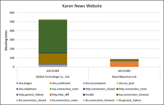 At the beginning of the COVID-19 pandemic a proliferation of fake news started spreading regarding the pandemic which was challenging for the government to counter. Then the Myanmar Press Council released a press statement including a list of sites viewed as spreading “fake news”.32 The 2020 OONI report, showed that Internet Service Providers (ISPs) in Myanmar received a directive from the Ministry of Transport and Communications to block 230 websites.33 Telenor Myanmar (previously renamed as ATOM) disclosed that they blocked access to 230 websites, but the list of these URLs has not been published. However, the OONI measurement revealed that 174 domains had been blocked through DNS by Telenor Myanmar under the pornography and news media categories (under the pretext that these sites could potentially be viewed as “fake news”). The Myanmar Press Council’s list of blocked domains contain sites belonging to news outlet and content relating to News pornography. In March 2020, the Frontier reported that 50 “fake news”34 sites including ethnic media outlets, such as Rakhine-based Development Media Group (DMG) and Narinjara were blocked under section 77 of the Telecommunications Law. According to Myanmar illegal contents such as drugs, alcohol, or gambling, and pornography are highly restricted in addition to prohibition of sexual education content and homosexuality.35 By far the most censored content online is that of political dissidents. Any criticism or anti-military content, directly or indirectly in opposition to the current military authorities can lead to jail sentences under existing laws. Human Rights Watch reported 98 journalists arrested for violating section 505A of the penal code according to the Assistance Association for Political Prisoners, as of October 25, 2021.36 Since the passing of the year anniversary of the coup d’etat, more than 100 journalists have been arrested.37