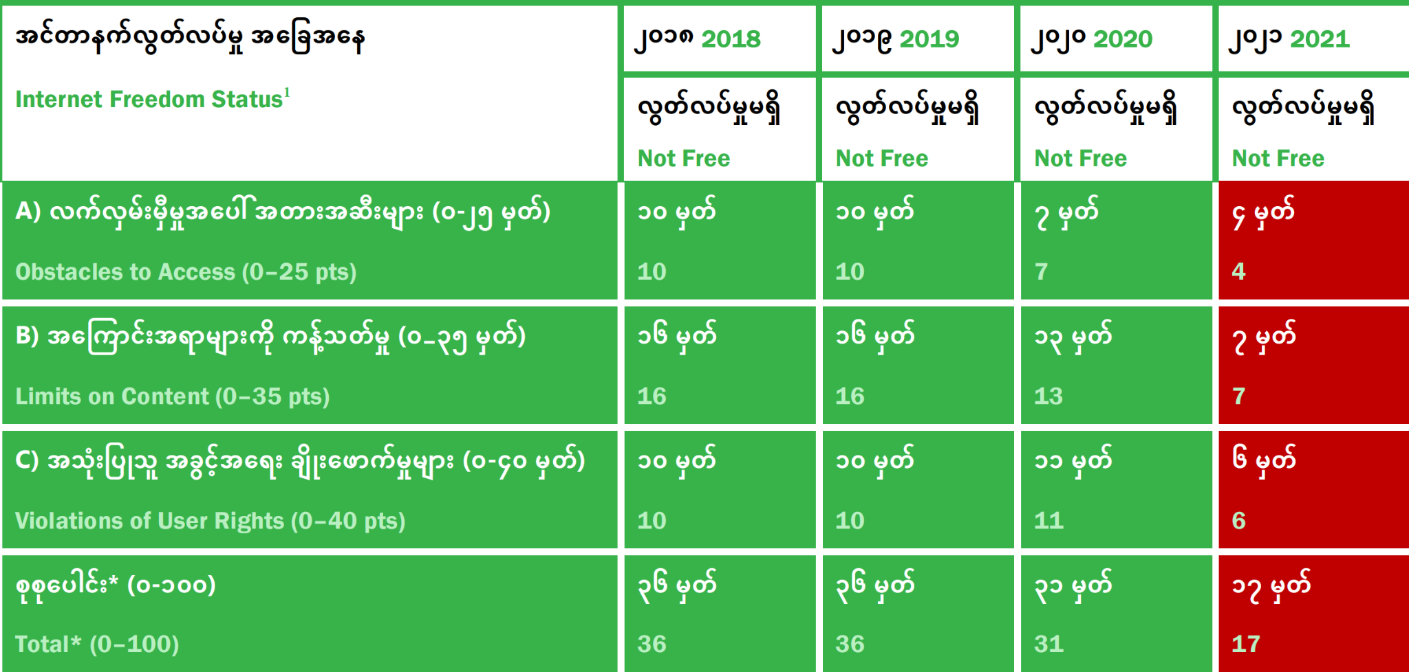 1. Freedom House. (2021). _2021 Myanmar Country Report. _https://freedomhouse.org/country/myanmar/freedom-net/2021 ↩︎