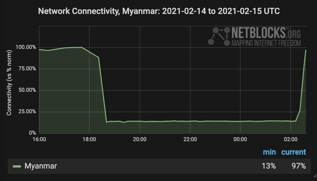 62. Netblocks. (2021, January 31). _Internet disrupted in Myanmar amid apparent military uprising. _https://netblocks.org/reports/internet-disrupted-in-myanmar-amid-apparent-military-uprising-JBZrmlB6 ↩︎